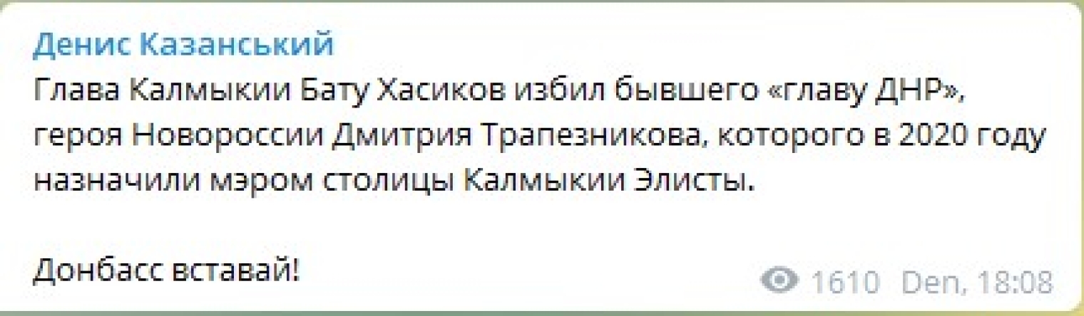Глава Калмыкии (Россия) Бату Хасиков избил главу городской администрации Элисты Дмитрия Трапезникова, бывшего главаря боевиков так называемой ДНР, который ранее прострелил ногу своему соратнику.