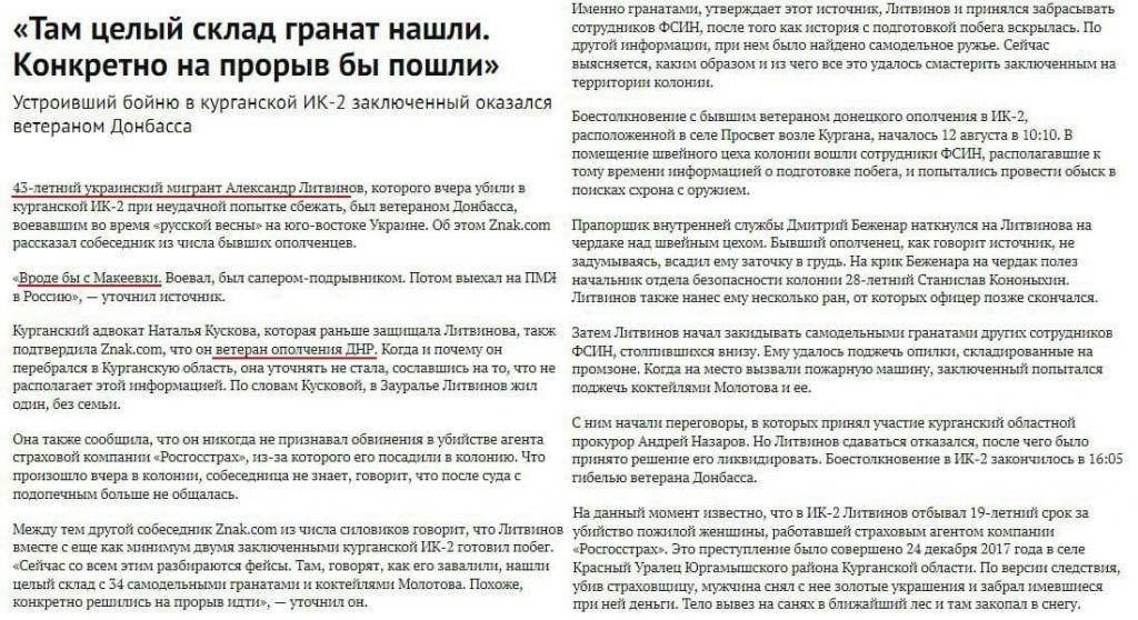 В результате побега 12.08.2021 из Курганской ИК-2 (РФ) был убит так называемый «ветеран ополчения ДНР» Александр «Балтика» Литвинов.
