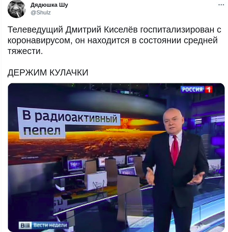 Топ-пропагандист Владимира Путина, который ведет телепрограмму “Вести недели” на государственном телеканале “Россия-1”, Дмитрий Киселев попал в больницу с COVID-19.