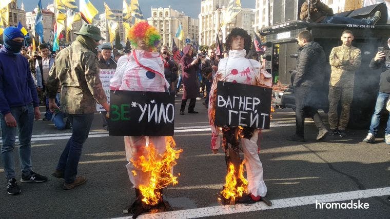 На Крещатике участники марша сожгли чучела президента Владимира Зеленского и, вероятно, главы его Офиса Андрея Ермака.