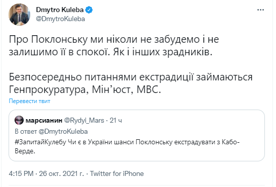 "О Поклонской мы никогда не забудем и не оставим ее в покое. Как и других предателей", – написал Кулеба.