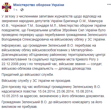 Тогда в ведомстве сообщили, что в 2014-2015 годах Зеленскому четыре раза направлялись повестки о призыве на службу по мобилизации, а тот четыре раза их проигнорировал.