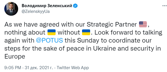 В то же время на странице украинского президента в Twitter 31 декабря появилось сообщение, в котором сказано, что Зеленский с нетерпением ждет разговора с Байденом. Он отметил, что стратегический партнер нашего государства, США, выполняет договоренность "ничего об Украине без Украины".