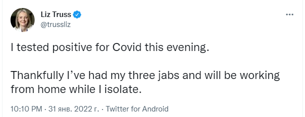 Ожидалось, что вместе с Джонсоном в Украину прилетит министр иностранных дел Соединенного Королевства Лиз Трасс, но вчера она получила положительный COVID-тест и ушла на самоизоляцию. Трасс вместе с главами украинского и польского МИД должна была объявить о создании альянса между Киевом, Лондоном и Варшавой.