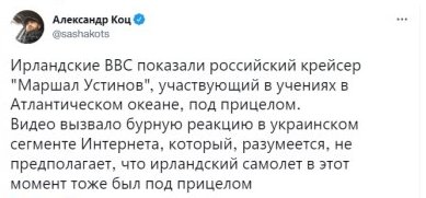 ВВС Ирландии обнародовали видео, на котором держат в прицеле российский ракетный крейсер "Маршал Устинов". Корабль принимает участие в военных маневров Северного флота РФ.