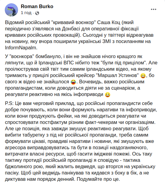 Учредитель проекта "InformNapalm" Роман Бурко обратил внимание на реакцию российского пропагандиста Александра Коца на публикацию видео.