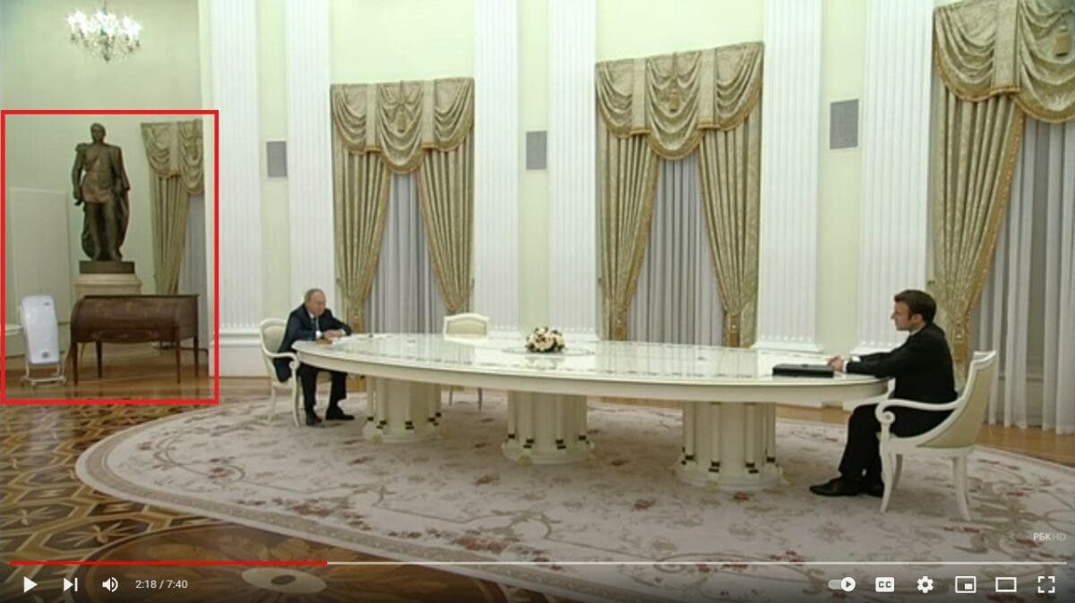 Пользователи заметили, что Путин и Макрон во время переговоров сидели за невероятно длинным столом. При этом в углу зала стоял бактерицидный облучатель. Таким образом, президента России высмеяли из-за излишней боязни заразиться коронавирусом.