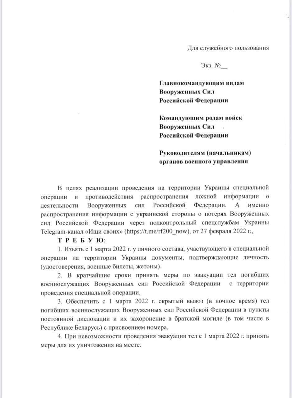 В приказе требуется забрать у всех российских военных документы, которые могут подтвердить личность, а тела уже погибших оккупантов с 1 марта вывезти тайно в ночное время в РФ или Беларусь, чтобы похоронить на братской могиле под номерами.