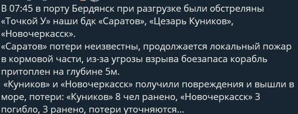 “В захваченном Россией порту Бердянск уничтожен большой десантный корабль «Орск» черноморского флота оккупантов”, — говорится в сообщении.
