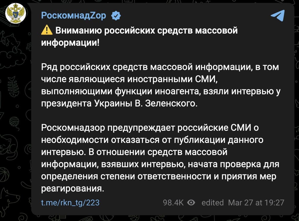 Михаил Подоляк прокомментировал запрет Роскомнадзора публиковать СМИ РФ интервью Владимира Зеленского, которое он дал представителям российских медиа: