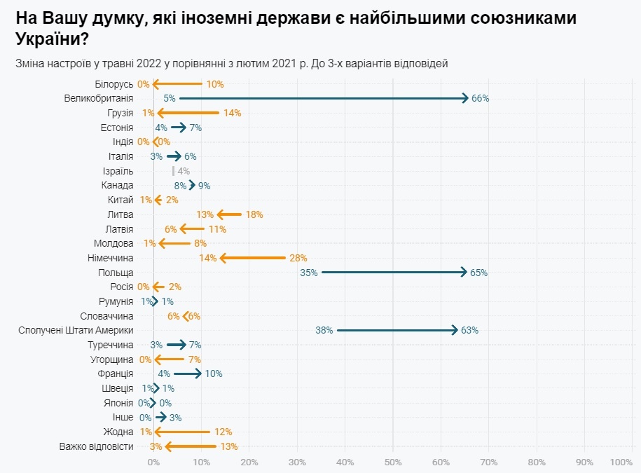 В тройку наибольших союзников также попали, по версии опрошенных, Польша (было 35%, стало 65%) и США (было 38%, стало 63%).