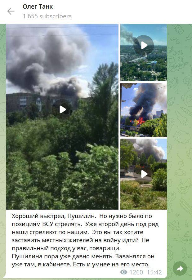 «Хороший выстрел, Пушилин. Но нужно было по позициям ВСУ стрелять. Уже второй день подряд наши стреляют по нашим. Это Вы так хотите заставить местных жителей на войну идти? Неправильный подход у вас, товарищи. Пушилина пора уже давно менять. Завонялся он уже там, в кабинете. Есть и умнее на его место».