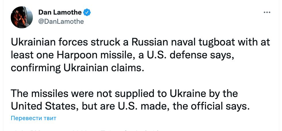Буксир оккупантов "Василий Бех" был поражен как минимум одной американской противокорабельной ракетой "Гарпун", сообщил журналист The Washington Post Дэн Ламот, сославшись на источник в Пентагоне.