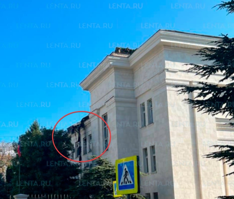 Он также продемонстрировал крышу здания Черноморского флота, в которую якобы влетел беспилотник. По его словам, “серьезных разрушений нет”.