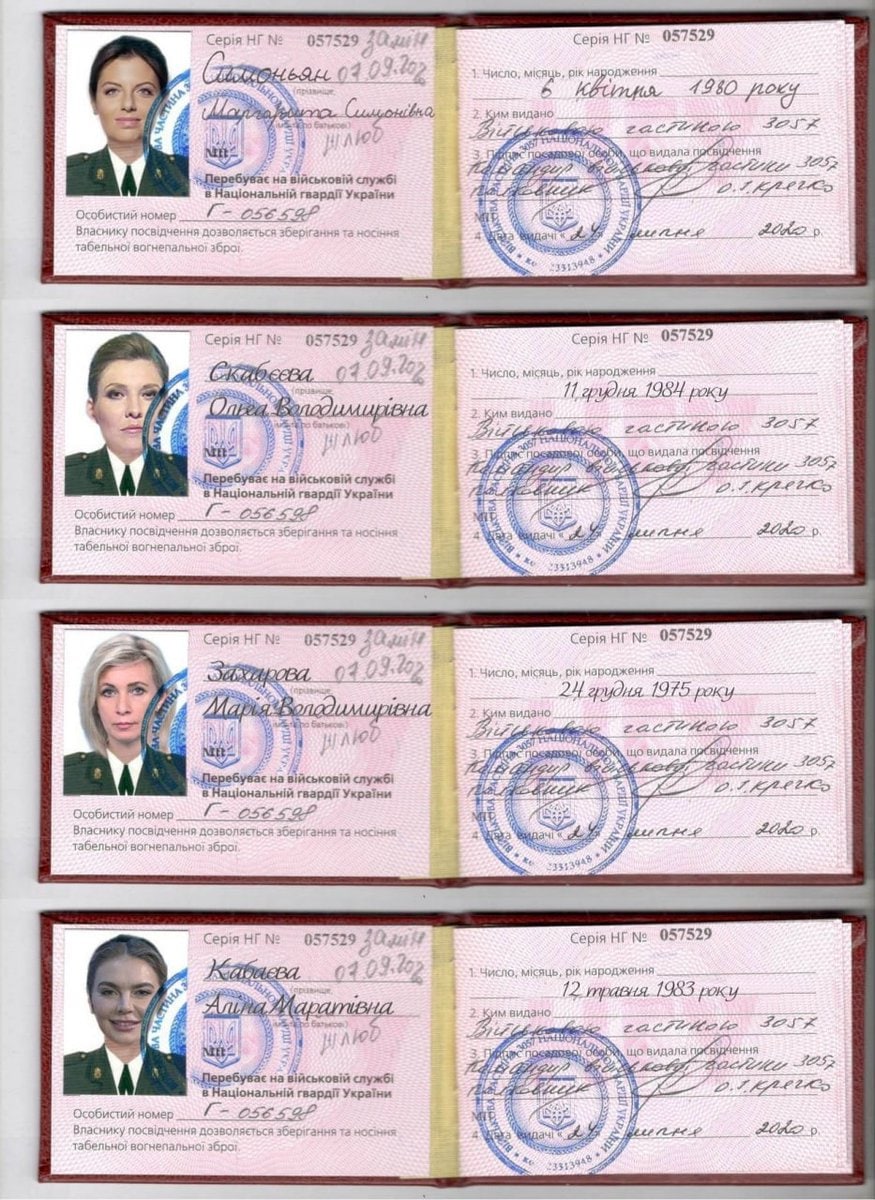 Там опубликовали серию фейковых документов – удостоверений о пребывании на военной службе в НГУ, оформленных на имена российских пропагандисток Маргариты Симоньян и Ольги Скабеевой, представительницы российского МИД Марии Захаровой и предполагаемой любовницы российского президента, спортсменки Алины Кабаевой.