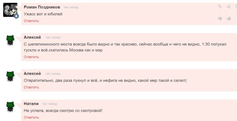 Говорят, что салют в Москве недостреляли. По плану было положено 5 минут салюта. Внезапно свернули после 2 минут. На некоторых заявленных площадках вообще ничего не было.