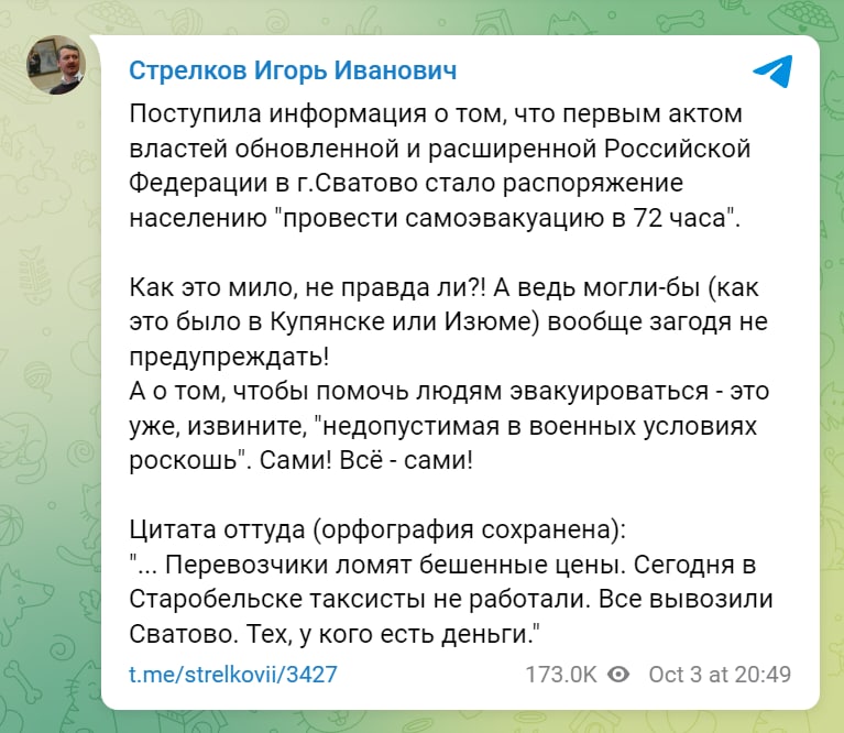 По словам экс-командира незаконных вооруженных формирований на Донбассе Игоря Гиркина с позывным Стрелков, первым актом властей "обновленной и расширенной российской федерации" в оккупированном Сватово стало распоряжение населению "провести самоэвакуацию в 72 часа".