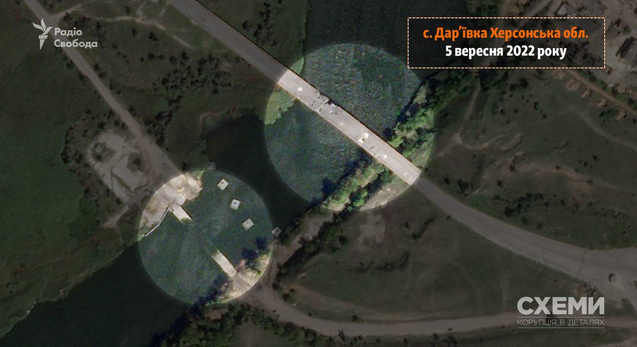 «Рядом с разрушенным ранее силами ВСУ Дарьевским мостом спутник зафиксировал две понтонные переправы, которые оккупанты используют для пересечения реки Ингулец. Одна из этих переправ находится вплотную к Дарьевскому мосту, а другая – на расстоянии более сотни метров. Последняя, похоже, возведена оккупантами на замену той, которая была ранее и которую также уничтожили ВСУ ракетными ударами, еще 5 сентября», — пишут «Схемы».