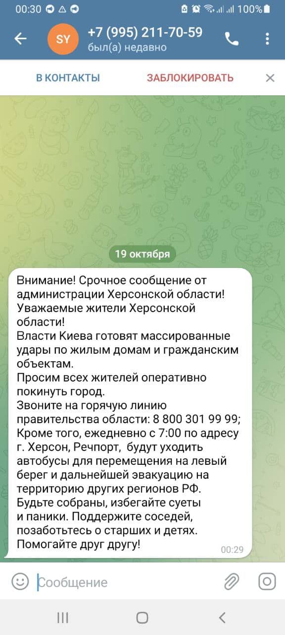 Жители Херсона начали получать сообщения от оккупационной администрации с призывом к эвакуации.