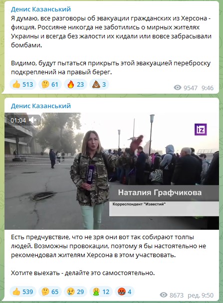 Подозрения, что эвакуация в Херсоне может свидетельствовать о подготовке оккупантами провокаций, высказал журналист Денис Казанский.