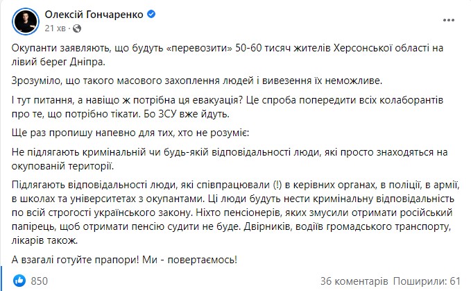 Народный депутат от «Европейской Солидарности» Алексей Гончаренко, комментируя объявленную оккупационными властями Херсона эвакуацию, напомнил, что жителям оккупированных территорий не грозит уголовная ответственность после деоккупации, если они не сотрудничали с врагом.