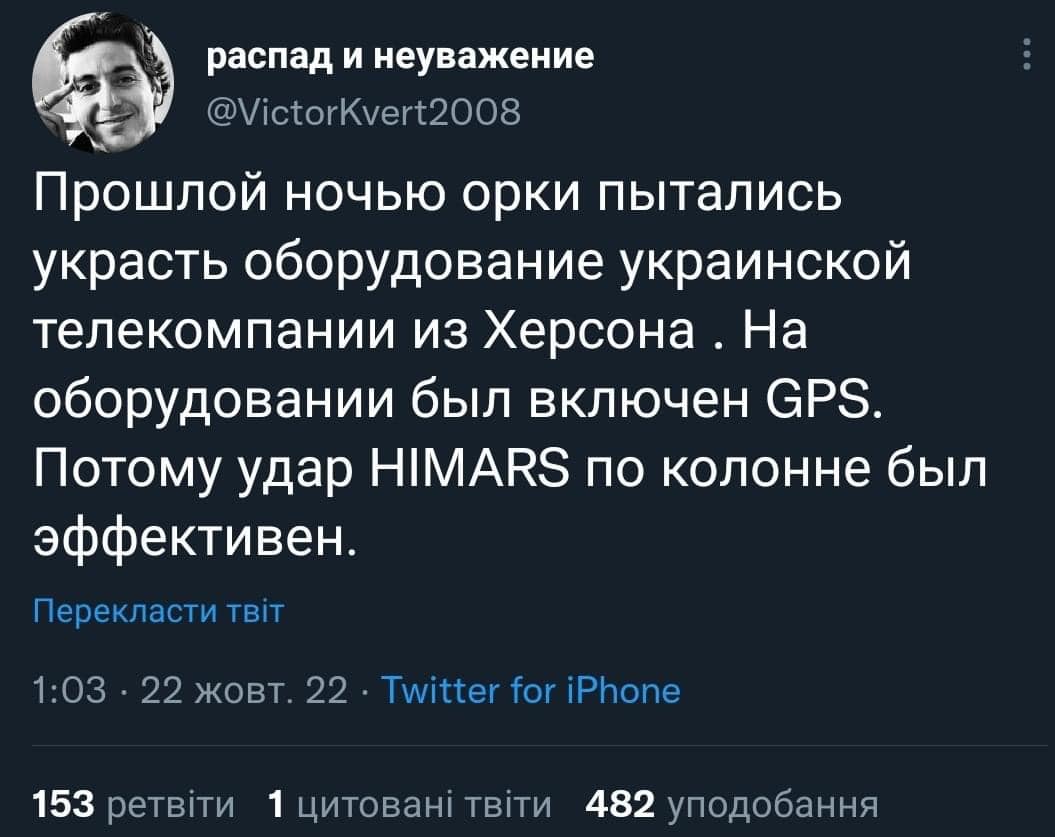 Когда орки начали выть о том, что от обстрела пострадали гражданские, на что командование ВСУ парировало, что в Украине с 23:00 действует комендантский час и что гражданским в это время запрещено появляться на улице, а тем более – у объектов, которые носят важный характер.