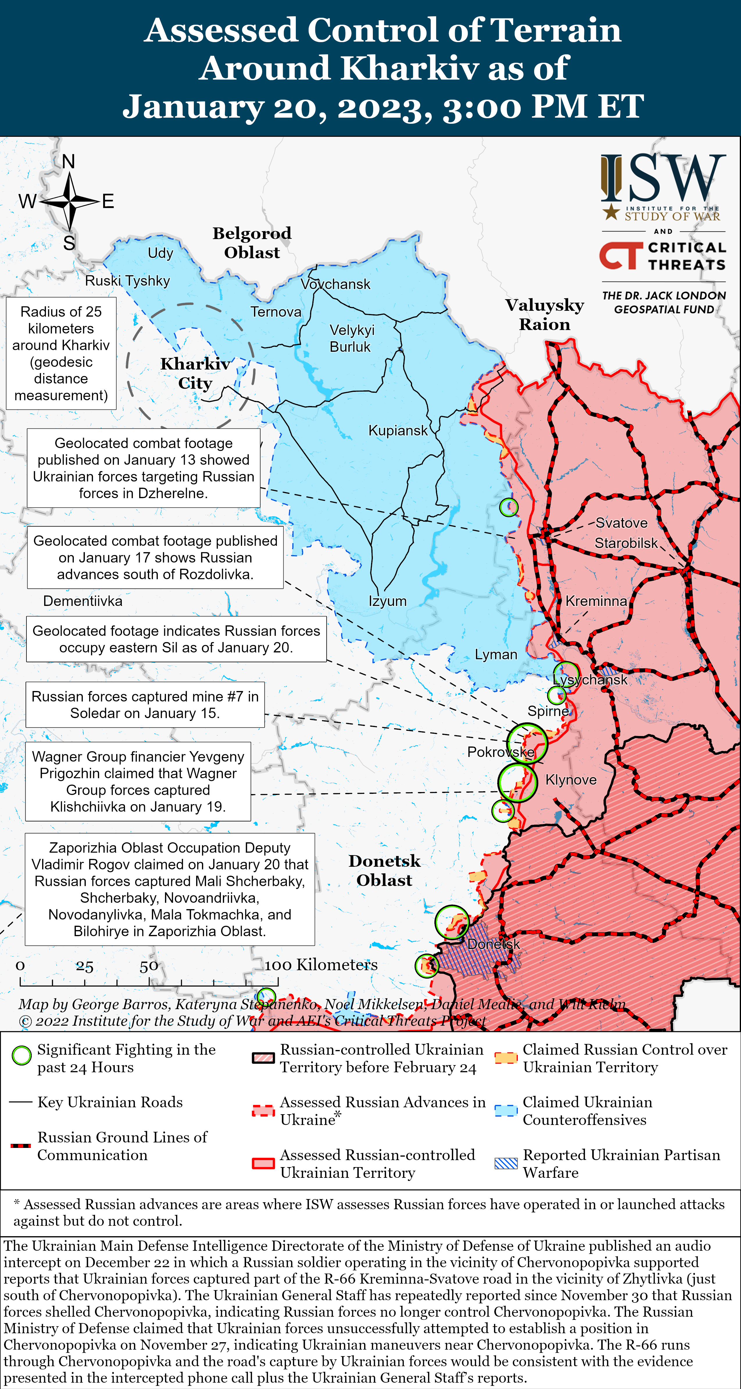 Маловероятно, что российские войска в ближайшем будущем смогут совершить оперативное окружение, поскольку недавние наступления с целью захвата небольших населенных пунктов, не имеющих большого тактического значения, скорее всего, привели к еще большему ослаблению российской живой силы и техники в этом районе.