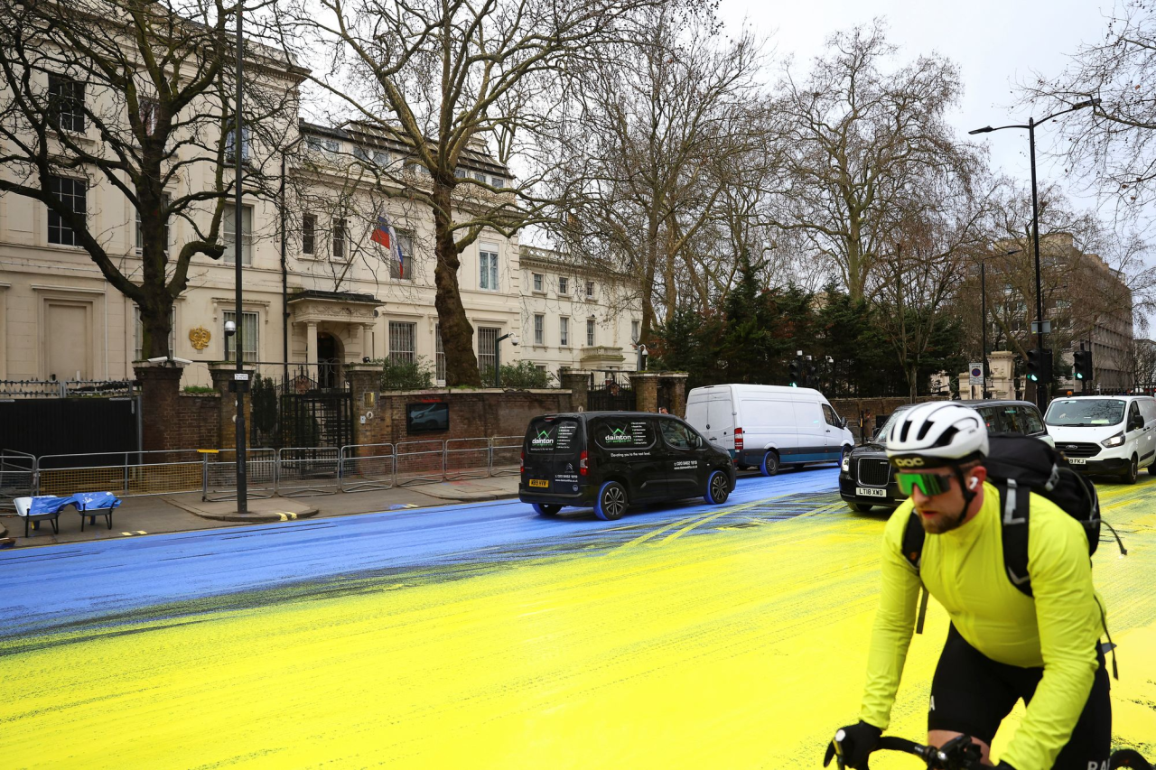 23 февраля, активисты организовали акцию протеста перед посольством России в Лондоне. К годовщине полномасштабного вторжения России в Украину они покрасили дорогу в цвета украинского флага.