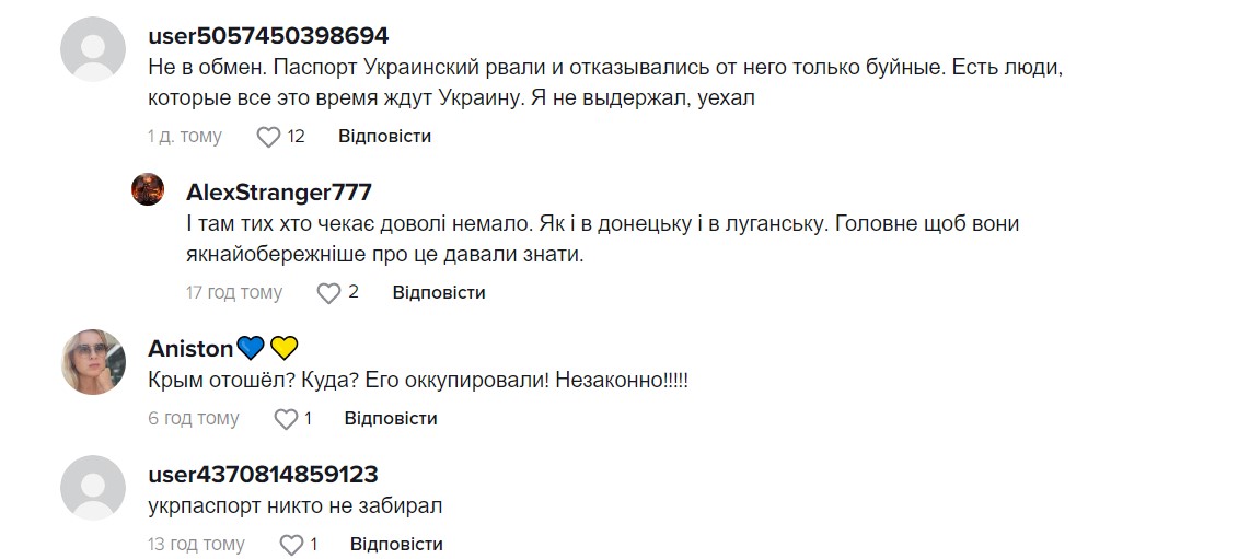 В комментариях к видео Летиции говорят, что такая ситуация не уникальна. Многие жители Крыма поступили так же, поскольку все это время ждут Украины, просто не уехали по определенным причинам.