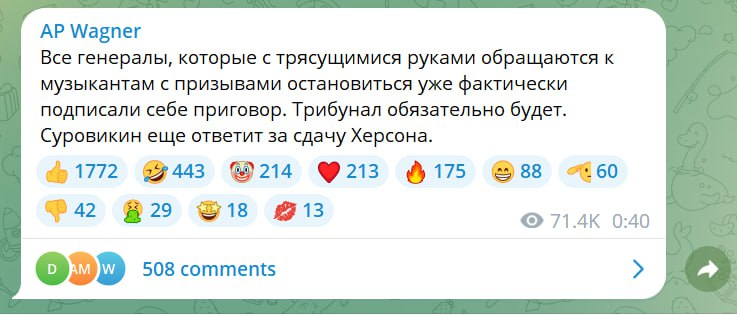 "Командиры ЧВК "Вагнер№ остаются верны самому перспективному политику и будут выполнять любой его приказ. Ни ФСБ, ни Суровикин уже не смогут остановить то что началось. Все генералы, которые с трясущимися руками обращаются к музыкантам с призывами остановиться уже фактически подписали себе приговор. Трибунал обязательно будет. Суровикин еще ответит за сдачу Херсона", - сказано в сообщении.
