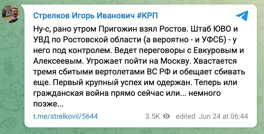 Пригожин в Ростове-на-Дону заявил о контроле «Группой Вагнера» здания штаба, а также взятии под контроль аэродрома.