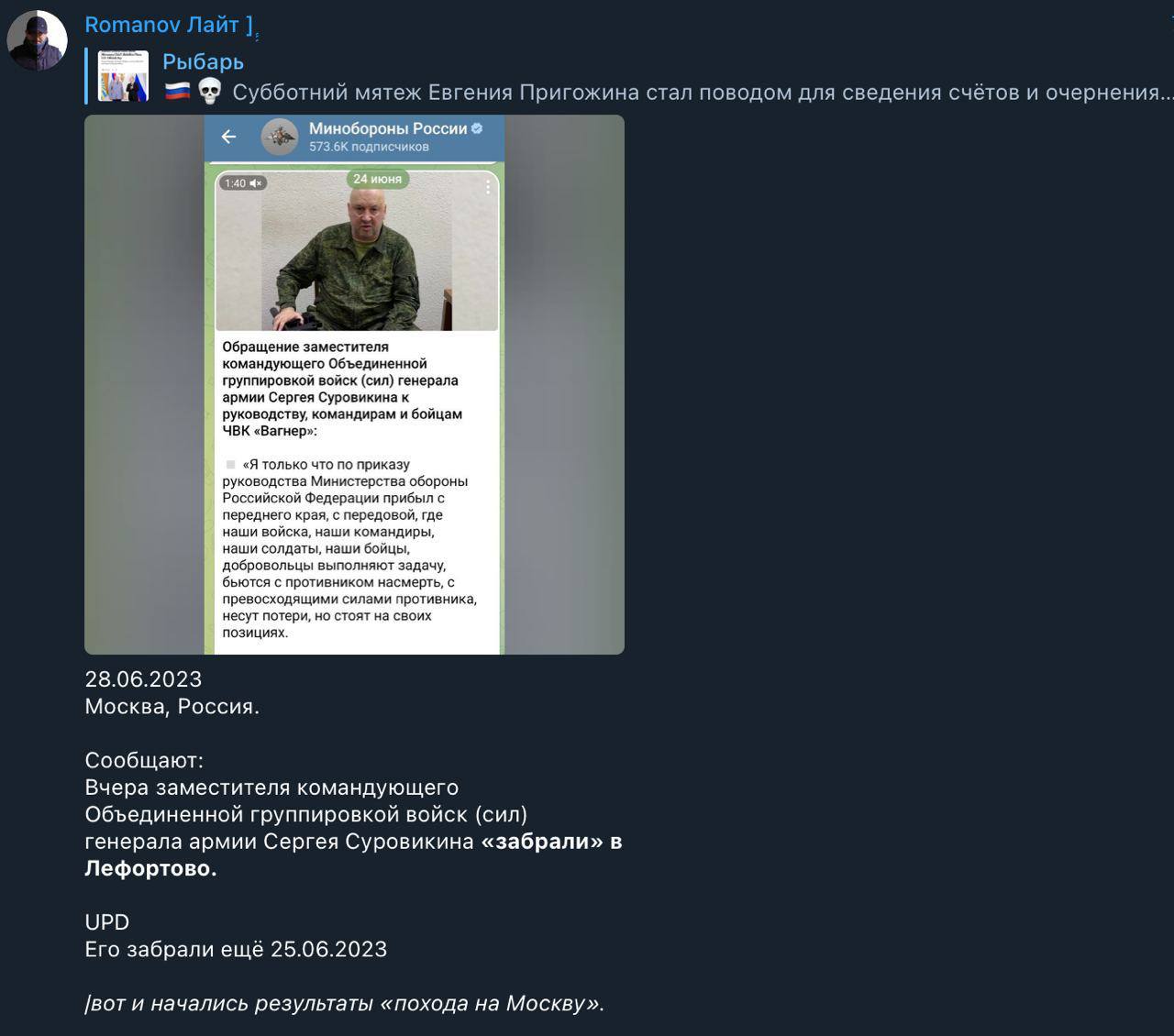 Пригожин работал с генералом Суровикиным во время российской военной интервенции в Сирии и назвал его самым способным командиром российской армии. Бывшие официальные лица заявили, что генерал Суровикин не поддерживал отстранение Путина от власти, но, по-видимому, согласился с г-ном Пригожиным в том, что г Шойгу и генерал Герасимов должны быть освобождены от должности.