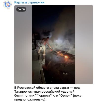 Дроном, который взорвался под Таганрогом мог быть российский разведывательно-ударный беспилотник "Форпост-РУ" или "Орион", пишут Z-паблики