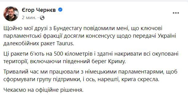 – Только что мои друзья из Бундестага сообщили мне, что ключевые парламентские фракции достигли консенсуса относительно передачи Украине дальнобойных ракет Taurus, – написал он.