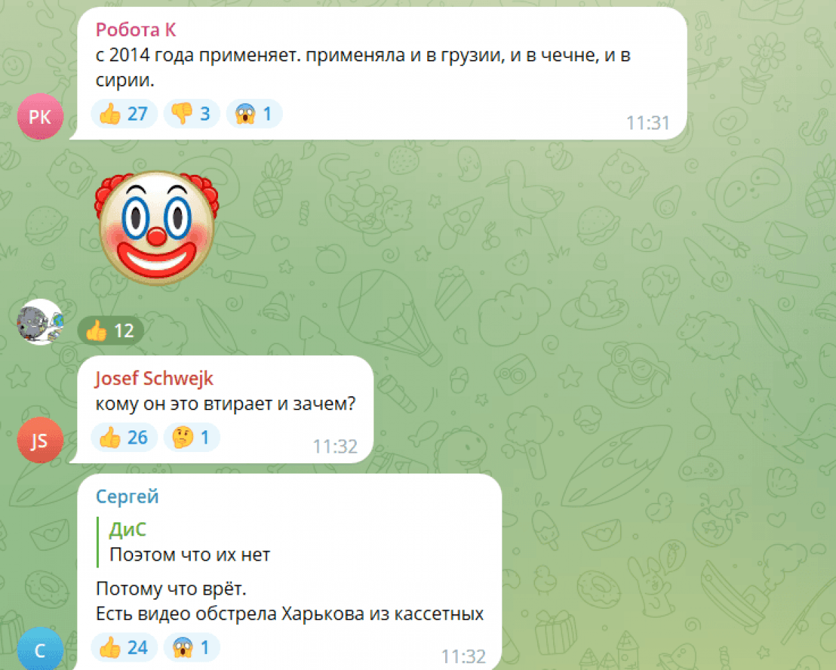 Под постом о Шойгу на одном из телеграм-каналов пропагандистских СМИ комментаторы напомнили, что Россия била кассетными боеприпасами не только по городам Украины, но и по Грузии: "Врут, как дышат. С первых дней войны применяют"; "Такие, блин, гуманитарии у нас вообще"; "Хватит смеяться, может ему правда не сообщили", - заявили россияне.