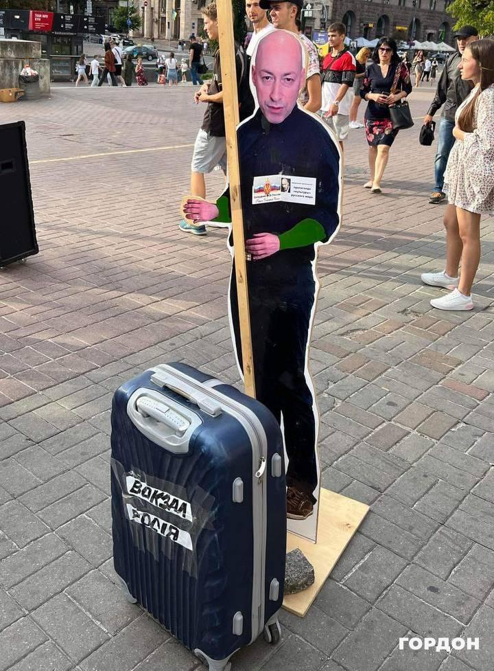 В начале сентября группа лиц устроила возле станции метро "Крещатик" акцию протеста против ряда украинских политиков и журналистов. Они, в частности, вырезали фигуру Гордона из фанеры и поставили возле нее чемодан с надписью "Вокзал, Россия".