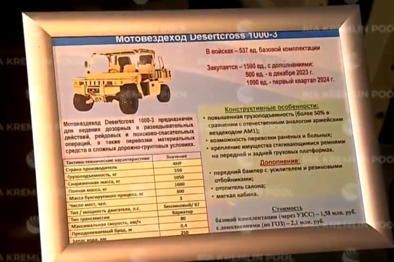 Согласно планам оккупантов, до конца 2023 года на вооружение российской армии должно быть поставлено 500 единиц DesertCross 1000−3, а еще 1090 — в первом квартале 2024-го.