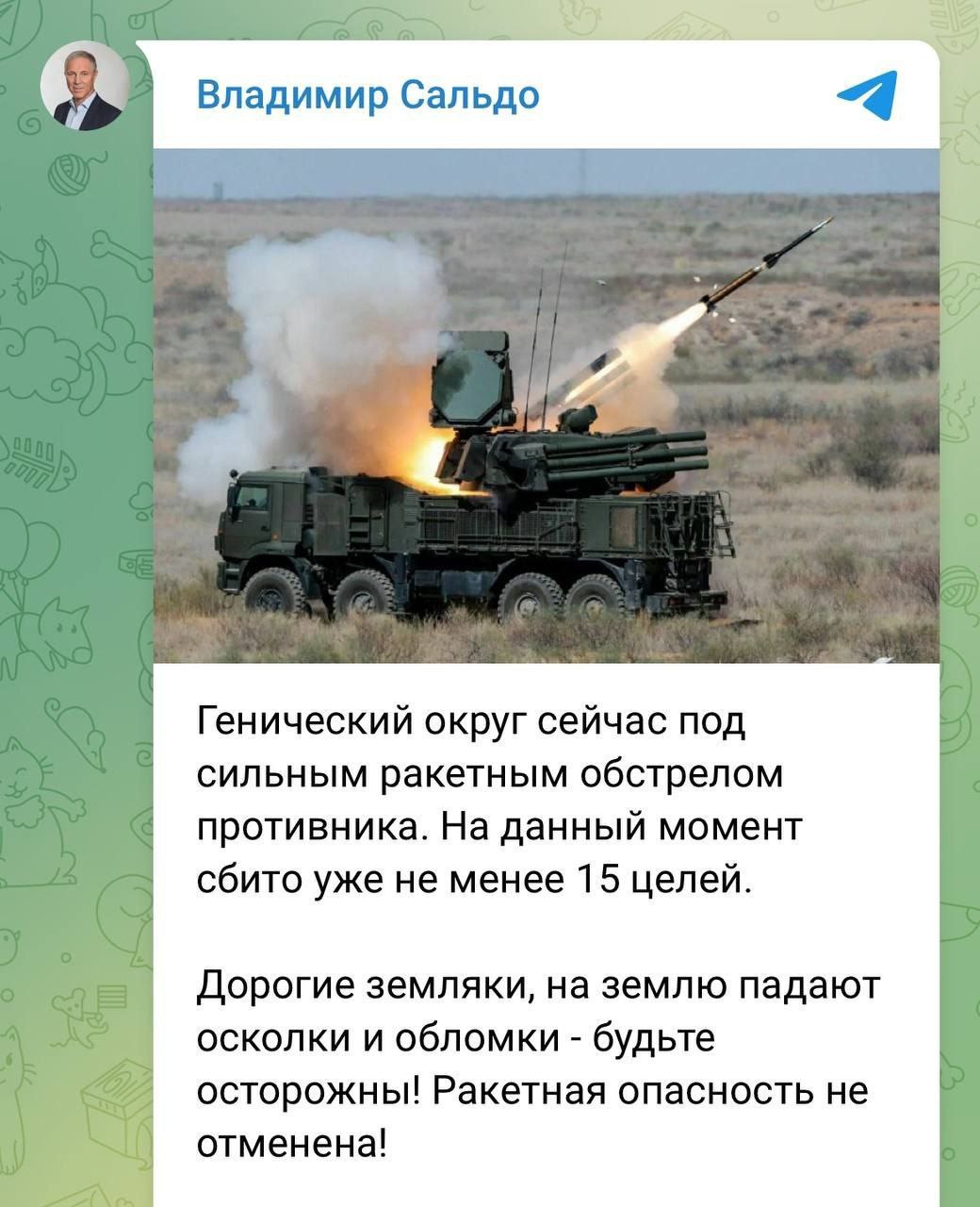 Официально оккупационные власти РФ уже отчитались о работе ПВО в Севастополе и в районе Геническа. Глава оккупационных властей Херсонщины Владимир Сальдо заявил о сбитии якобы 15 целей.