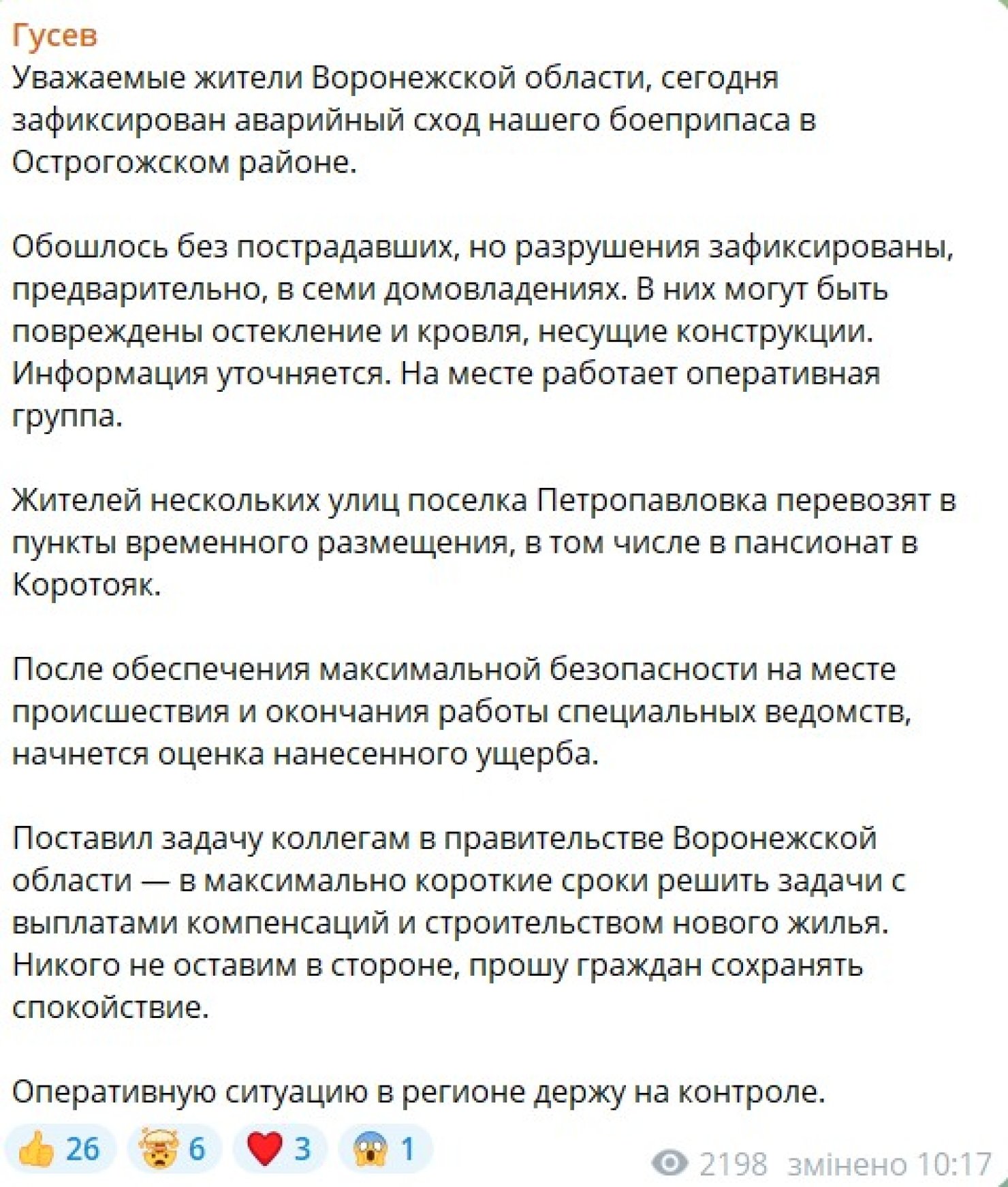 В 10:17 появилось заявление губернатора Воронежской области Александра Гусева. По словам россиянина, в Острогожском районе Воронежской области произошло "аварийное схождение боеприпаса", в результате чего повредило семь зданий. Также он уверяет, что ни один человек не пострадал в результате взрыва, который разрушил дома на целой улице.