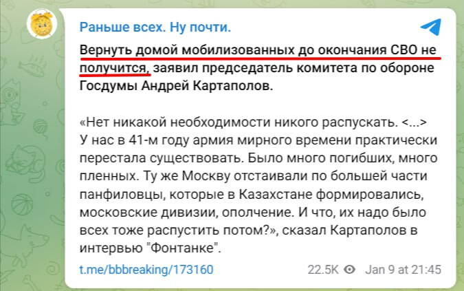 Депутата Госдумы, председателя комитета по обороне Андрея Картаполова спросили, почему нельзя вернуть домой 300 тысяч мобилизованных, если Минобороны РФ утверждает, что только в 2023 году они приняли на котракт 410 тысяч человек. Также ему напомнили о том, что жены мобилизованных требуют ротацию.