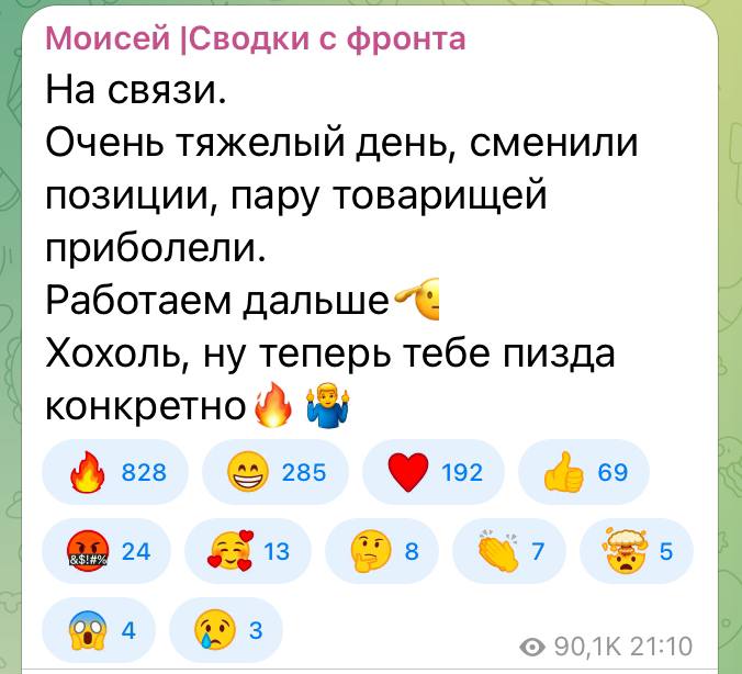18 января оккупант Моисей выходил на связь из Крынок. Он признался, что "в Крынках ад". Это сообщение отправлено 18 января около 21.00. А уже около 2.00 19 января в канале появился пост, в котором от имени жены оккупанта сообщается, что Моисей погиб.