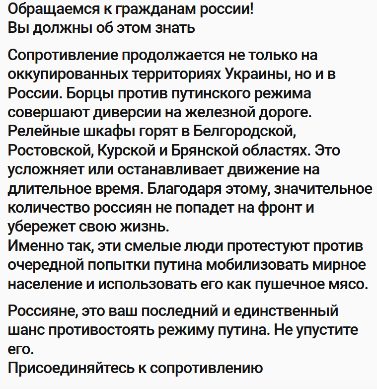 Там подчеркнули, что сопротивление продолжается не только на оккупированных территориях Украины, но и в России. Ведь борцы против нынешнего режима совершают диверсии на железной дороге.