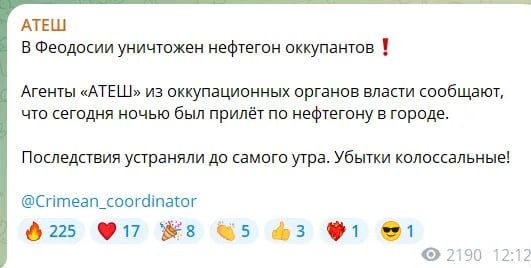 «В Феодосии уничтожен нефтегон оккупантов. Агенты «АТЕШ» из оккупационных органов власти сообщают, что сегодня ночью был прилёт по нефтегону в городе. Последствия устраняли до самого утра. Убытки колоссальные!», – отмечено в сообщении.