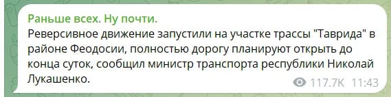 По состоянию на 12 часов по киевскому времени так называемый «министр транспорта» оккупационного «правительства» Крыма Николай Лукашенко заявил о запуске реверсивного движения на ранее перекрытом участке трассы «Таврида».