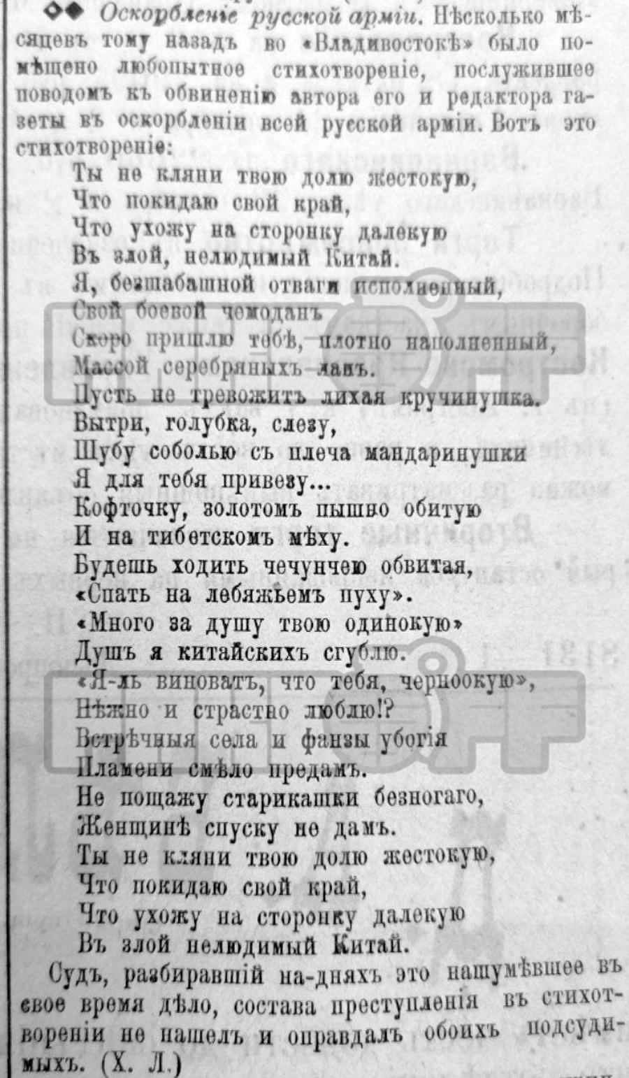 “Оскорбление русской армии. Несколько месяцев тому назад во Владивостоке было помещено любопытное стихотворение, послужившее поводом к обвинению автора его и редактора газеты в оскорблении всей русской армии. Вот это стихотворение: