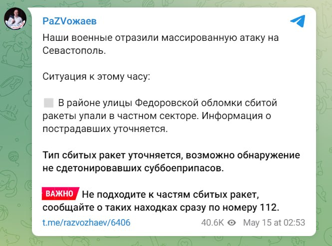 Развожаев также отмечал, что спасатели должны были тушить возгорание, которое возникло от якобы осколков ракет, упавших в районе села Полюшко. Он также отметил, что повреждений вроде как нет. Также в районе улицы Федоровской обломки сбитой ракеты якобы упали в частном секторе. Тип ракет и информация о раненых уточняется.