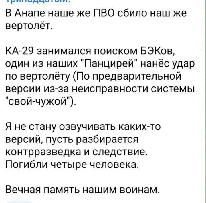«В Анапе наша же ПВО сбила наш же вертолет. КА-29 занимался поиском БЭКов (безэкипажных катеров). Один из наших «Панцирей» нанес удар по вертолету (по предварительной версии, из-за неисправности системы «свой-чужой»)», — написал ТГ-канал «Тринадцатый».