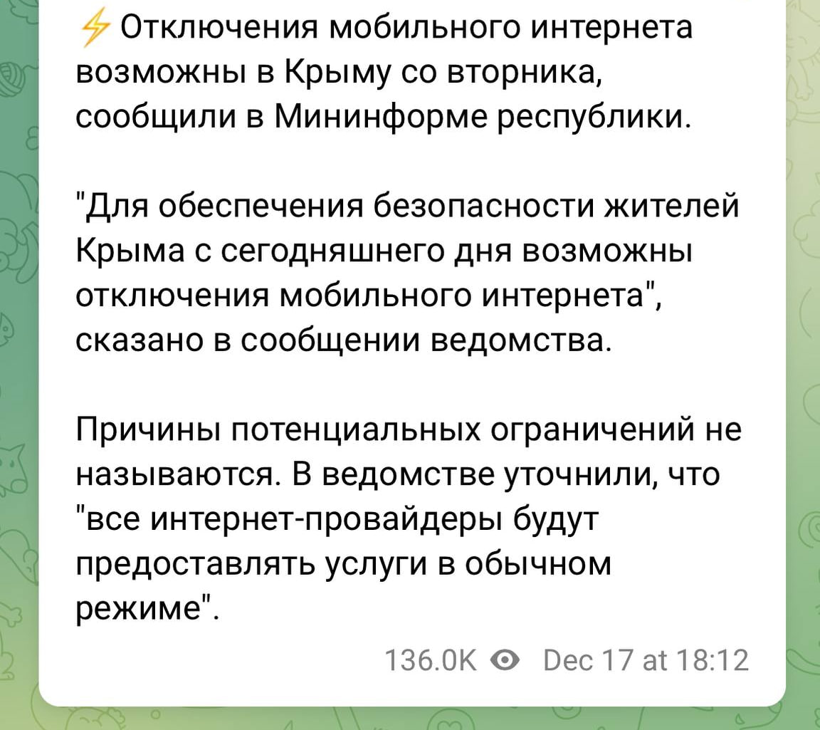 "Для обеспечения безопасности жителей Крыма с сегодняшнего дня возможны отключения мобильного интернета", – заявили там.