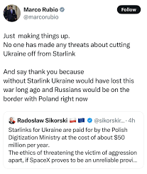 Рубио воспользовался случаем заявить, что без спутниковой связи Starlink «Украина уже давно бы проиграла войну, а россияне были на границе с Польшей».