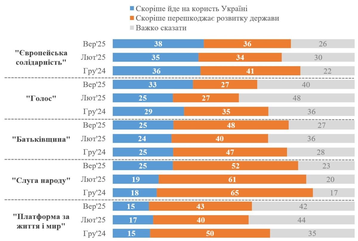 Полезной деятельность фракции “Слуга народа” считают 25% граждан, а 52% считают, что работа этой политической силы препятствует развитию государства.